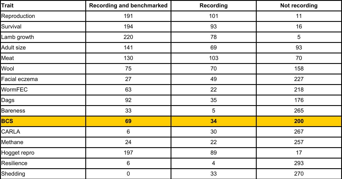 As you can see, out of those 303 maternal flocks, 69 were actively recording and benchmarking BCS, and a further 34 flocks had at least recorded the trait. But there were 200 flocks not recording BCS. Beyond the labour involved, this is a trait that is free to assess and record, with no lab testing or fancy equipment required. And it is a trait that has such a widespread effect on so many other aspects of production.